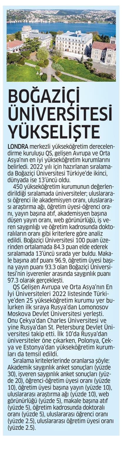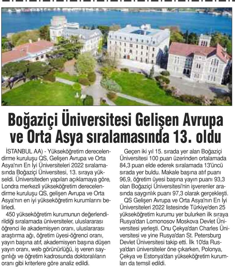 Boğaziçi Üniversitesi Gelişen Avrupa ve Orta Asya sıralamasında 13. oldu