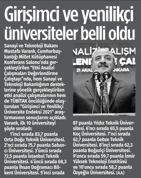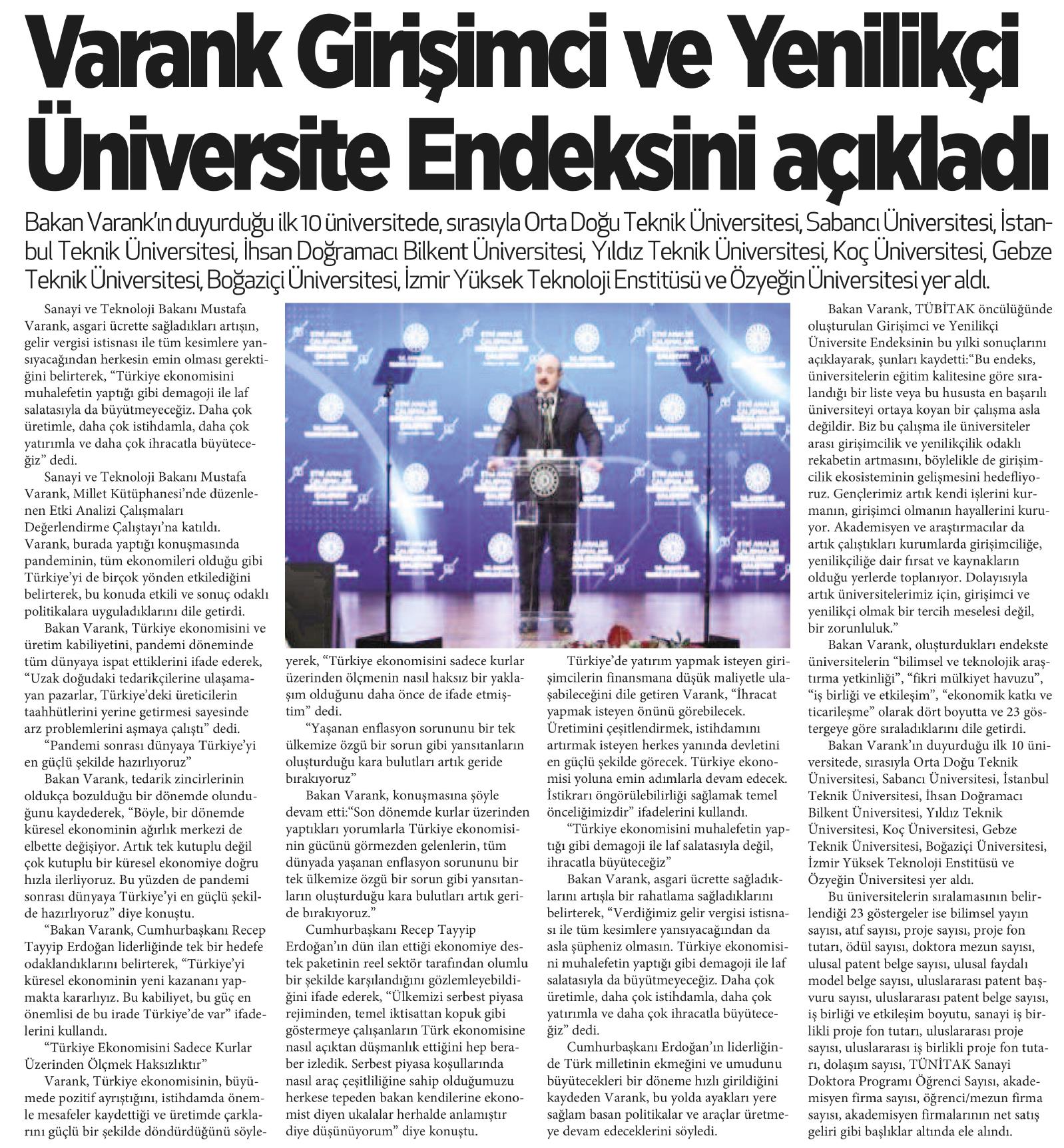 Varank Girişimci ve Yenilikçi Üniversite Endeksini açıkladı