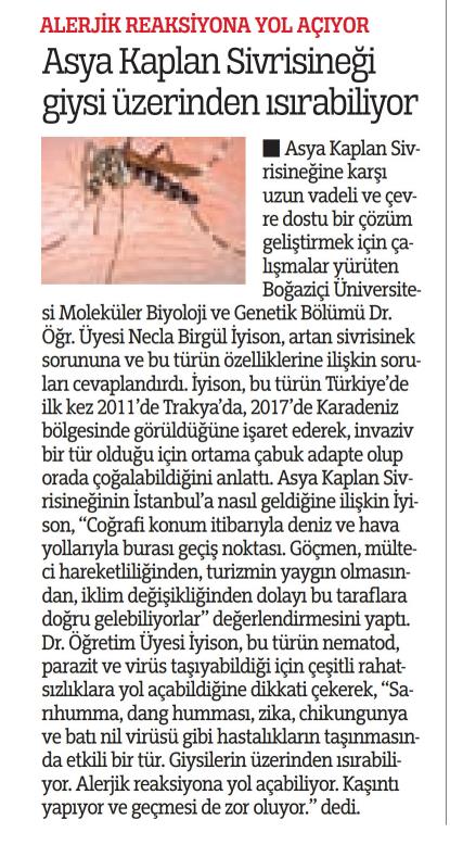 Asya Kaplan Sivrisineği giysi üstünden ısırabiliyor