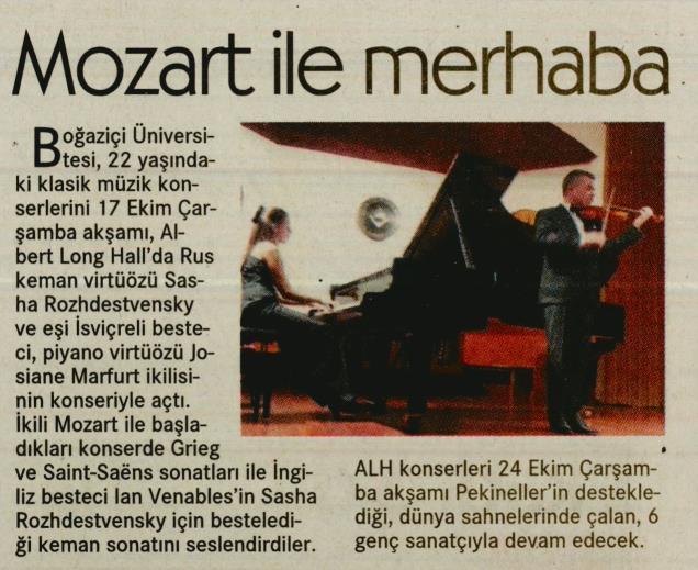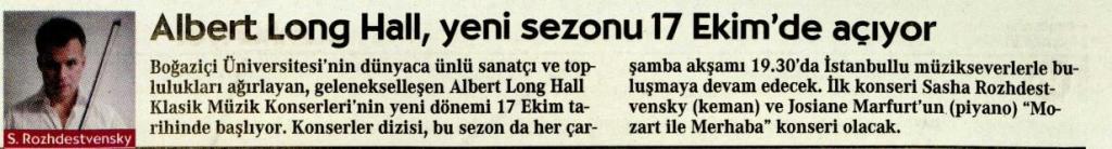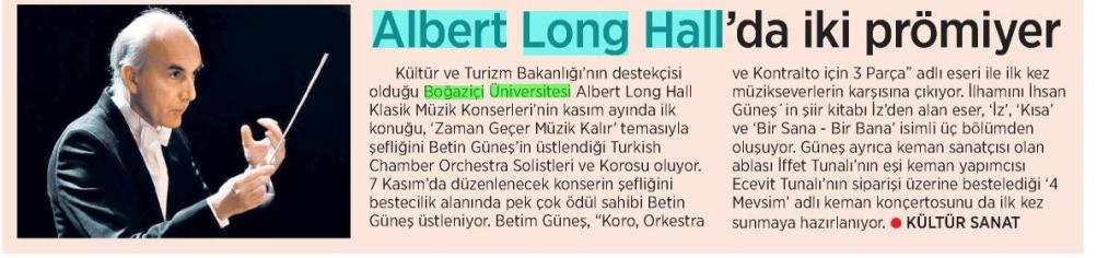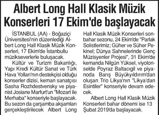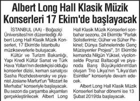 Albert Long Hall Klasik Müzik Konserleri 17 Ekim'de Başlayacak