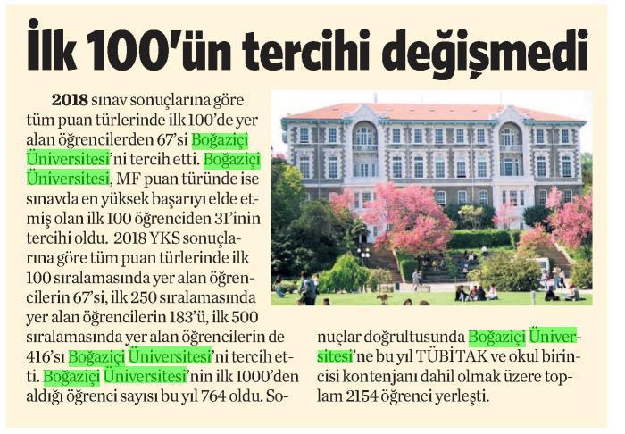 En iyi 100 öğrencinin 67'si Boğaziçi'ni seçti