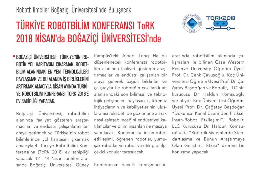 Türkiye Robotbilim Konferansı ToRK 2018 Nisan'da Boğaziçi Üniversitesi'nde