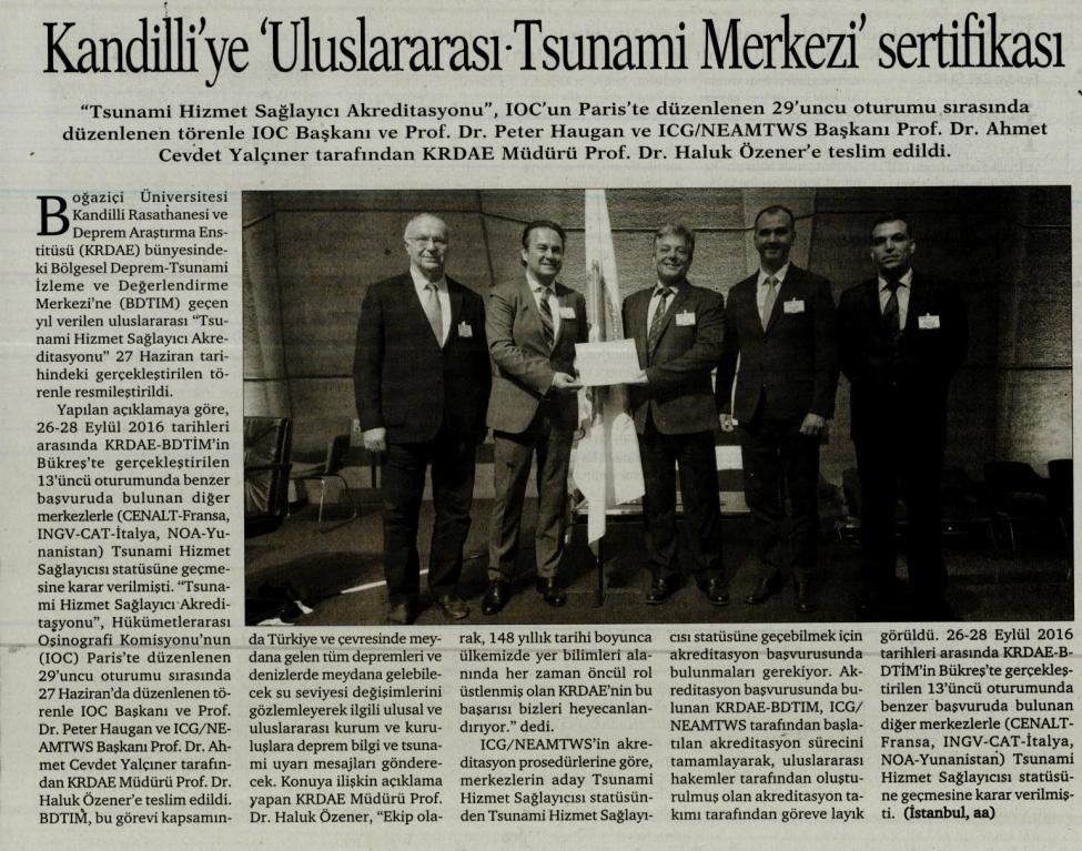 Kandilli'ye 'Uluslararası Tsunami Merkezi' Sertifikası