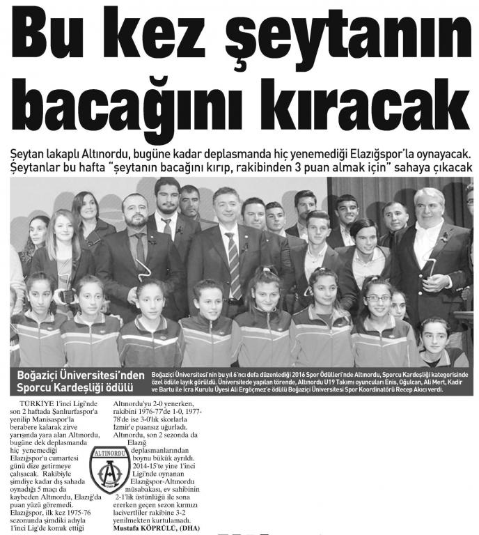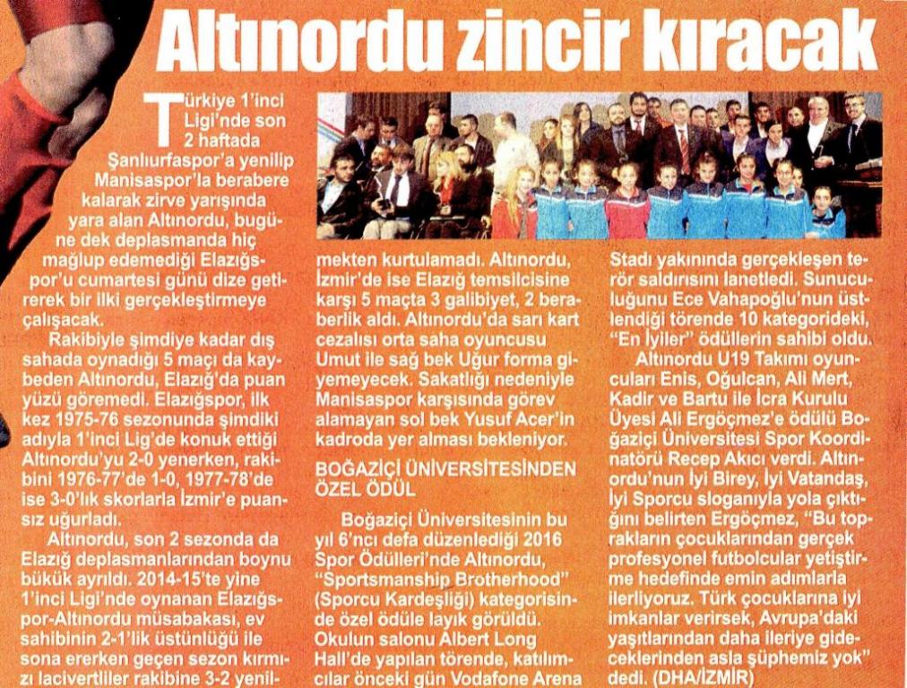 'Sporcu Kardeşliği' Ödülü Altınordu'ya
