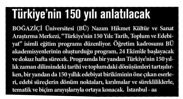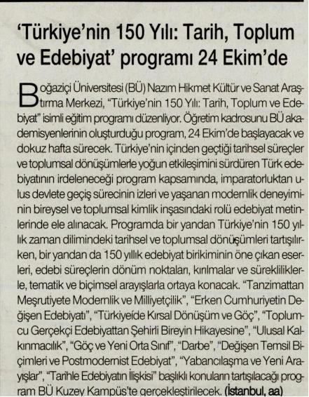 'Türkiye'nin 150 Yılı: Tarih, Toplum ve Edebiyat' programı 24 Ekim'de