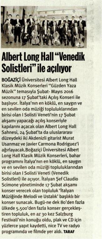 Albert Long Hall Venedik Solistleri ile açılıyor
