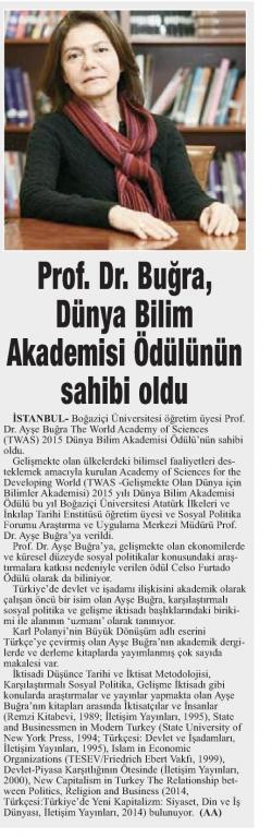 Prof. Dr. Ayşe Buğra Dünya Bilim Akademisi Ödülü'nün sahibi oldu