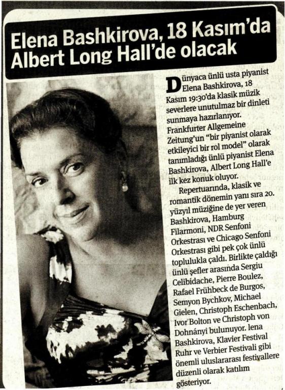 Elena Bashkirova 18 Kasım'da Albert Lon Hall'de