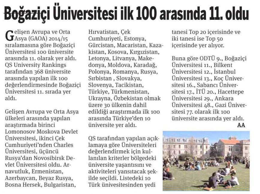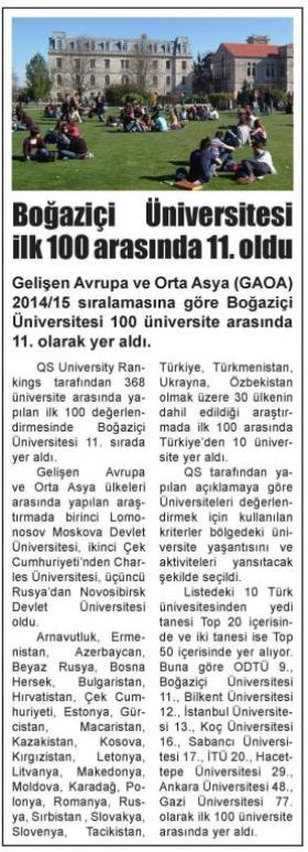 Boğaziçi Üniversitesi ilk 100 arasında 11.oldu