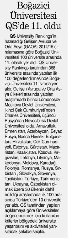 Boğaziçi Üniversitesi QS'te 11.oldu