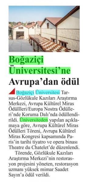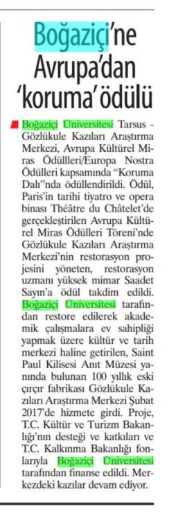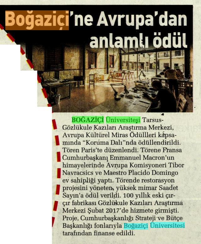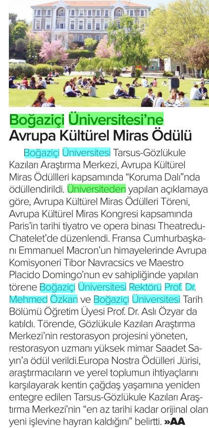 Europa Nostra Ödülü, Paris'te Boğaziçi Üniversitesi Tarsus-Gözlükule Kazıları Araştırma Merkezi'ne verildi