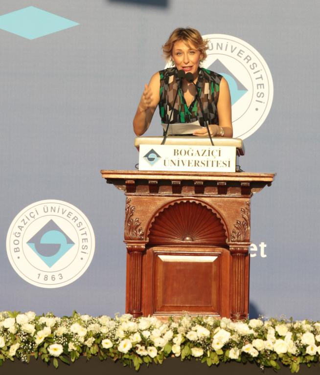 ‘’150 yıldır devam eden köklü Boğaziçi geleneğinin en son filizleri’’ ifadeleriyle nitelendirdiği mezunlara yönelik konuşmasını şöyle sürdürdü: ‘’Bu üniversiteye girdiğiniz andan itibaren, daha önceki hayatınızda henüz fark etmediyseniz, sizden farklı olanların da ne kadar değerli olduğunu fark edersiniz. Farklılıklardan düşüncenin, düşünceden soruların, sorulardan bilginin doğduğu bir döngü içinde bulursunuz kendinizi.