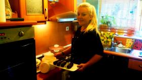 “Bana önce telefonumdan mesaj geliyor. Hemen alışverişe gidiyorum. Ben biraz fazla menü koyuyorum, herkes bilir bunu, 20 porsiyon 10 çeşit yemek falan. Tüm malzemeler olmayabiliyor evde, hemen koştura koştura markete gidiyorum. En güzellerini seçerim her zaman, oradaki sebzeleri beğenmezsem başka markete gidiyorum, hiç üşenmem. Eve dönünce düzenli bir şekilde tek tek yapıyorum yemekleri. O yüzden benim 12 saat bile sürer on yemeği hazırlamam. Birkaç yemek birden yapmayı sevmem, teker teker yaparım, biri bitince tadına bakarım güzel olmuşsa diğerine geçerim. Şikâyet gelmesini asla istemediğim için çok özenli çalışırım. Geçen hafta bir tiramisu faciam oldu. Kaba koyarken tiramisu ezildi, hiç üşenmeden gecenin bir yarısı açık olan bakkal bulup malzemeleri alıp tekrar yaptım.”