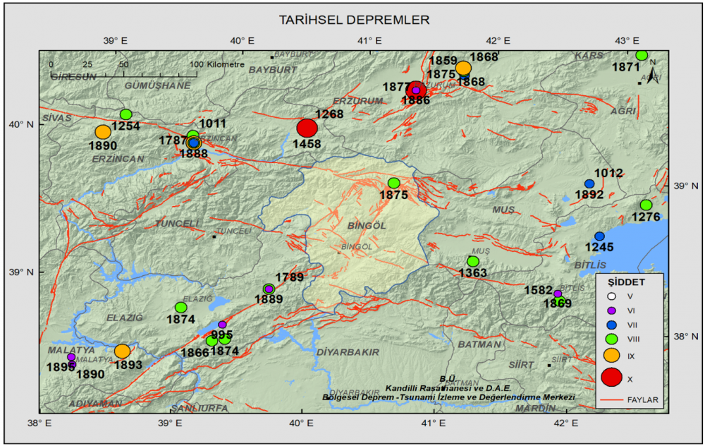MTA’nın Diri Fay Haritası’nda da bölgedeki kırık yapıyı çok net olarak görme şansımız var. Burada çok fazla fay parçacığı var. Bu fayların enerji biriktirmelerinden sonra kırılmaları çok doğal. Yine Doğu Anadolu ile Kuzey Anadolu fayları kesişiminde geçmiş yıllarda pek çok deprem olduğunu biliyoruz. Bölge 10 şiddetinde depremler gördü. Buradaki depremleri Kandilli Rasathanesi, 1885 yılından beri kaydediyor.”