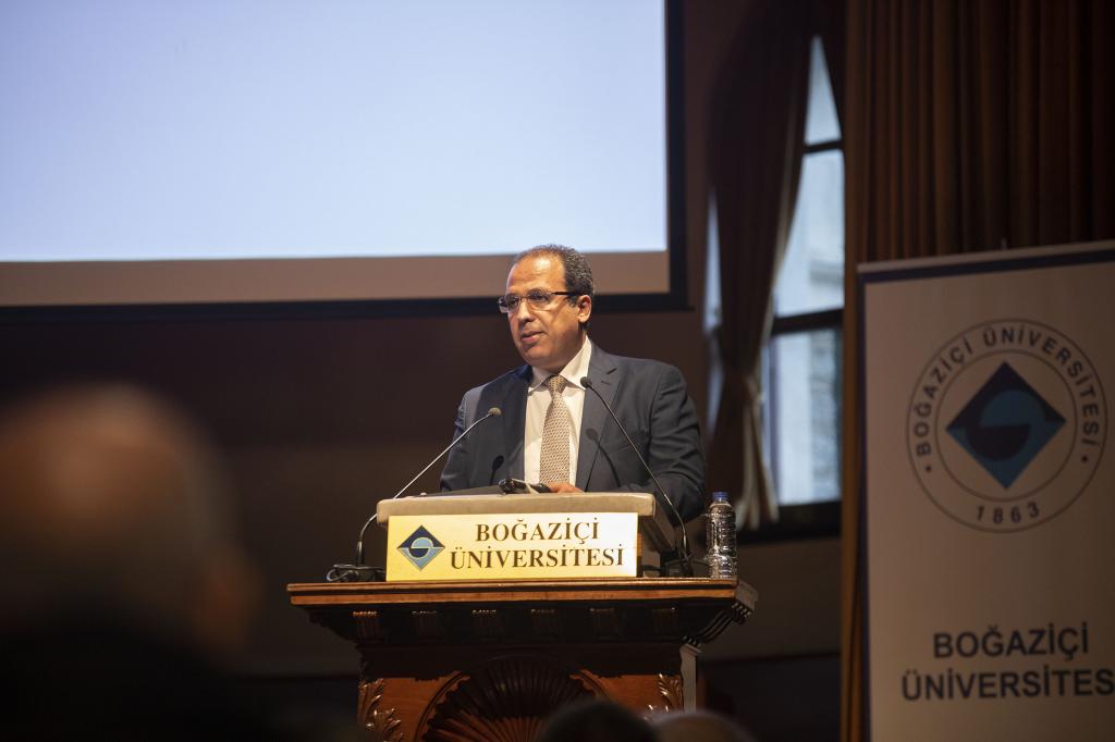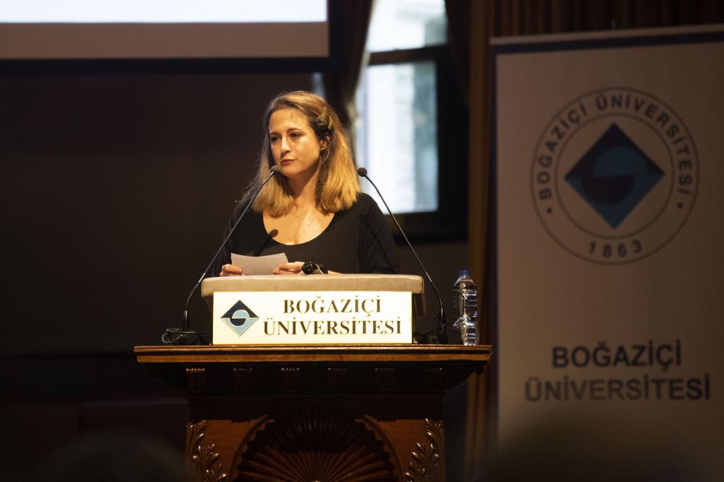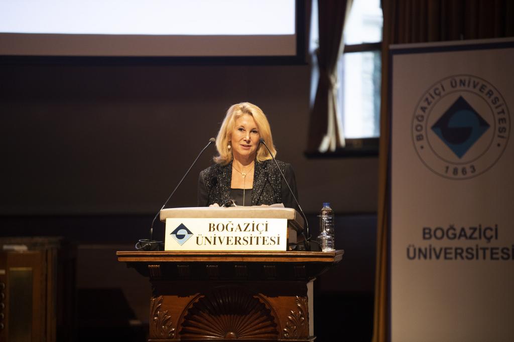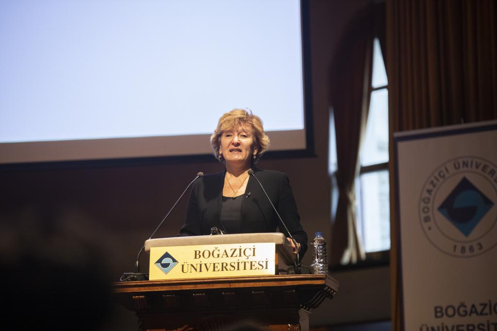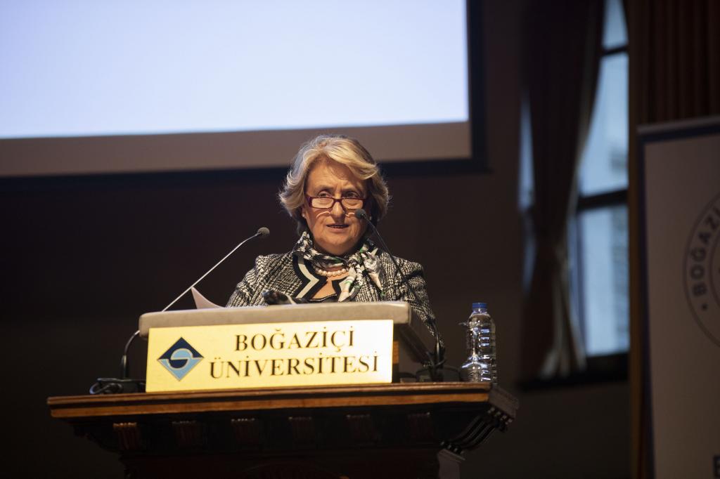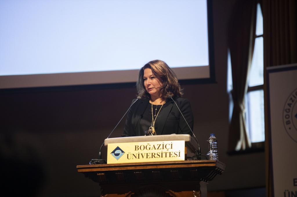 Boğaziçi Üniversitesi Rektör Yardımcısı Prof. Dr. Zeynep Atay, Prof. Dr. Mehmed Özkan adına buluşmanın açılışını yaptığı için onur duyduğunu belirterek Üstün Ergüder’le nasıl tanıştığını misafirlere aktardı: “Kendisini ilk defa rektörlük seçimleri için yaptığı konuşmada dinlemiştim. ‘Ben tenis oynarken işler aksamadan yürüyecek’ dediğinde çok şaşırmıştım ama 8 yıl boyunca hayatımızı nasıl iyi bir yönde değiştirdiğine şahit oldum.” Atay, sözlerini Üstün Ergüder’le çalışmış olmaktan gurur duyduğunu belirterek sonlandırdı.