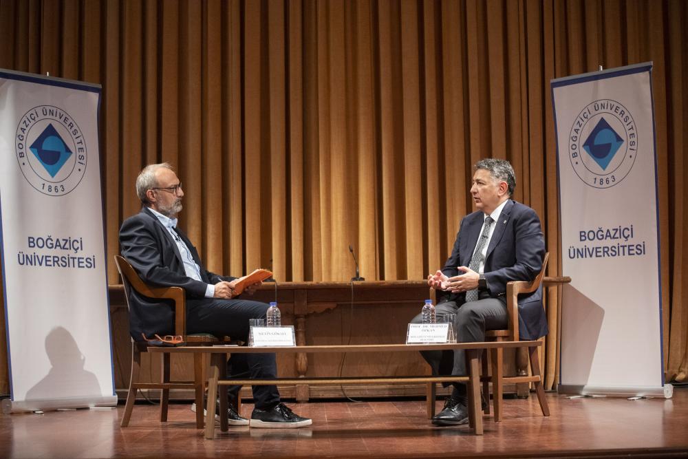 Üniversite’nin kuruluşundan beri temel bilimlerin gerçekten “temel” bir rol üstlenmiş olduğunu söyledi. Özkan, Boğaziçi’nin temel bilimler alanındaki güçlü konumunun, disiplinlerarası geçişi ve etkileşimi de güçlendirdiğini ekledi. Yurtdışından ve içinden seçkin araştırmacıların Boğaziçi Üniversitesi’ni seçmesinin nedenini, kendileri düzeyindeki araştırmacılarla etkileşime geçiyor olmaları olarak açıklayan Mehmed Özkan, teknoloji üretimi konusuna da değindi. Teknoloji üretiminde öncelikle kararlı ve sabırlı olunması gerektiğini söyleyen Prof. Dr. Mehmed Özkan, 15 yıl önce inovasyon için yapılan yatırımın karşılığının bugün alındığını ve ülkedeki araştırma sayısının 15 yılda 20 binlerden 130 binlere çıktığını ekledi.