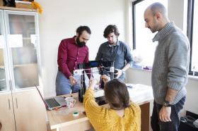 Kandilli Kampüsü’nde Feza Gürsey Binası’nda üç kata yerleşen KAHVE Lab’ın ilk katında bir makine atölyesi de yer alıyor. Bu atölyede deneyler için ürettikleri mekanik aksamı kendilerini şekillendiren ekip, bu sayede parça tasarım ve üretiminden, devre elektroniği ve veri alımına kadar bütün süreçleri kendileri yönetiyor. Atölye’nin işlevlerini Fizik Bölümü yüksek lisans öğrencisi Cihan Çiçek aktardı: