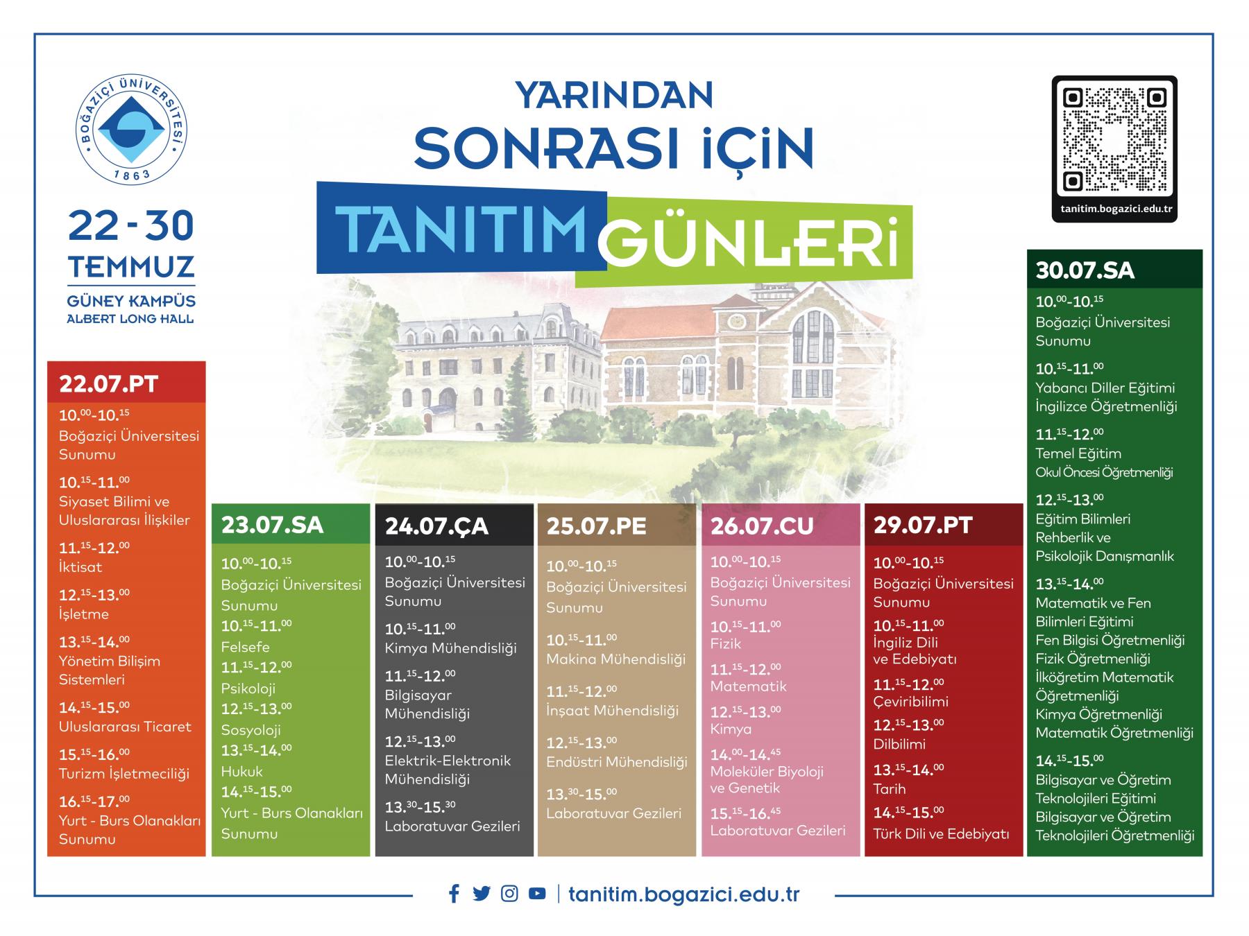Boğaziçi Üniversitesi Tanıtım Günleri’nde Mühendislik, İktisadi ve İdari Bilimler, Hukuk, Fen-Edebiyat ile Yönetim Bilimleri fakültelerine bağlı lisans programlarından uzmanlar ayrı oturumlarda adaylarla bir araya gelecek. Boğaziçi Üniversitesi Tanıtım Günleri kapsamında her gün saat 10.00’da başlayacak oturumlarla aday öğrenci ve ailelerini ağırlayacak.