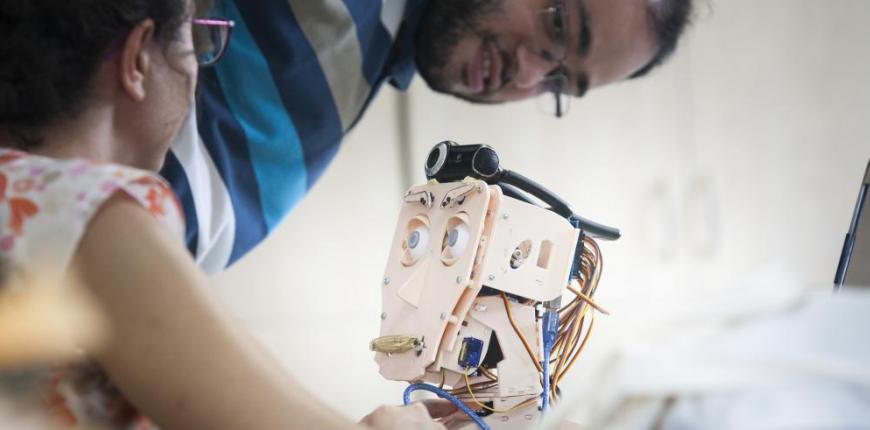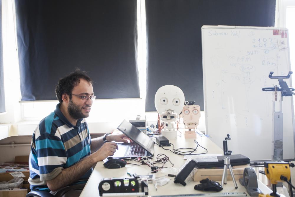 Dudak olarak yaylar kullandık. Biz konuşurken a,o, u gibi sesler çıkarabiliyoruz. Robotta o etkiyi verebilmek için o yayları kullandık. Hem konuşmak için hem de kendini ifade edebilmek için mimikleri var. Bu aslında konuşan bir sistem. Siz robotla konuşurken sizin ne dediğinizi anlıyor ve basit cevaplar verebiliyor. Şimdiki süreçte statik bir durumdan farklı olarak, insani etkileşim için konuşurken ağız hareketlerinin insan benzeri şekilde olmasını sağlamaya çalışıyoruz.