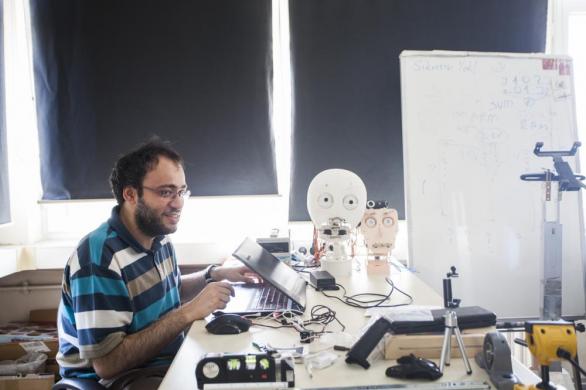 İbrahim Özcan: ‘’Boğaziçi University Social Robotic Assisstant” ya da kısaca BUSRA adını verdiğim bir robot yüzü üzerine çalıştım. Duyguları ifade edebilmek için bu yüzün altı farklı duygu durumunu da gösterebilecek şekilde olması gerekiyordu. Binnur’la konuşarak hangi serbestlik derecelerine sahip olması gerektiğine baktık. Gözleri için çekmeli -itmeli tendon sistemleri kullandık. Ağız yapısını ise kolay yapılabilir, üretilebilir ama çok fazla serbestlik derecesinde olan bir başka şekil bulamadığım için kendim tasarladım.