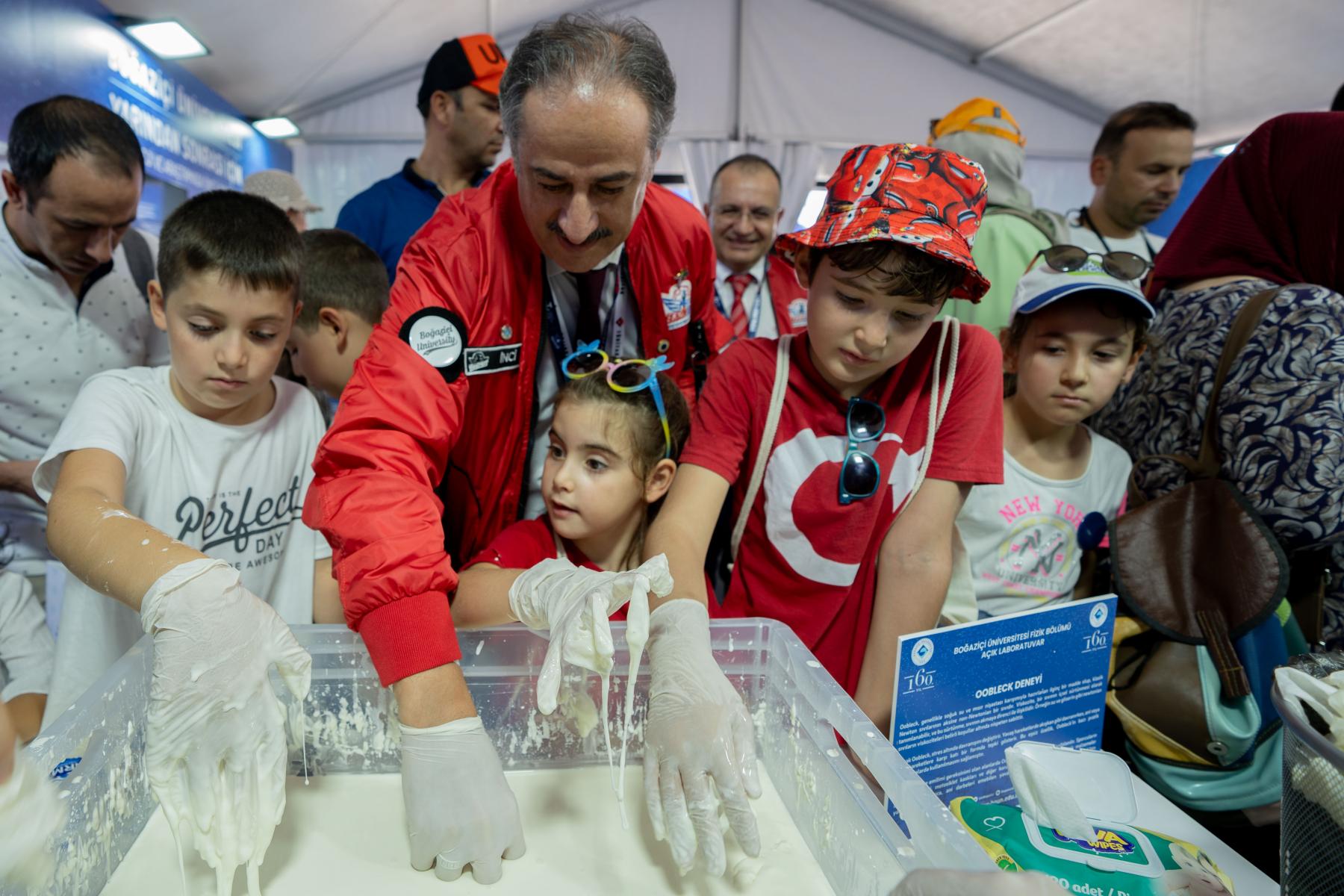 Boğaziçi Üniversitesi Fizik Bölümü de TEKNOFEST’te bilim meraklısı çocuk ve gençlere yönelik sunduğu eğlenceli deneylerle temel fizik kanunları hakkında bilgi verdi. Bu kapsamda Ooblek deneyi ile sıvının içsel sürtünmesi ve akmaya direnci; basınçlı hava obje uçurma deneyi ile hava basıncı ve momentum kavramları ve varil bükme deneyi ile de atmosfer basıncının gücü hakkında deneyler yapıldı.