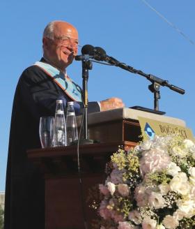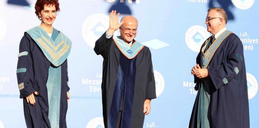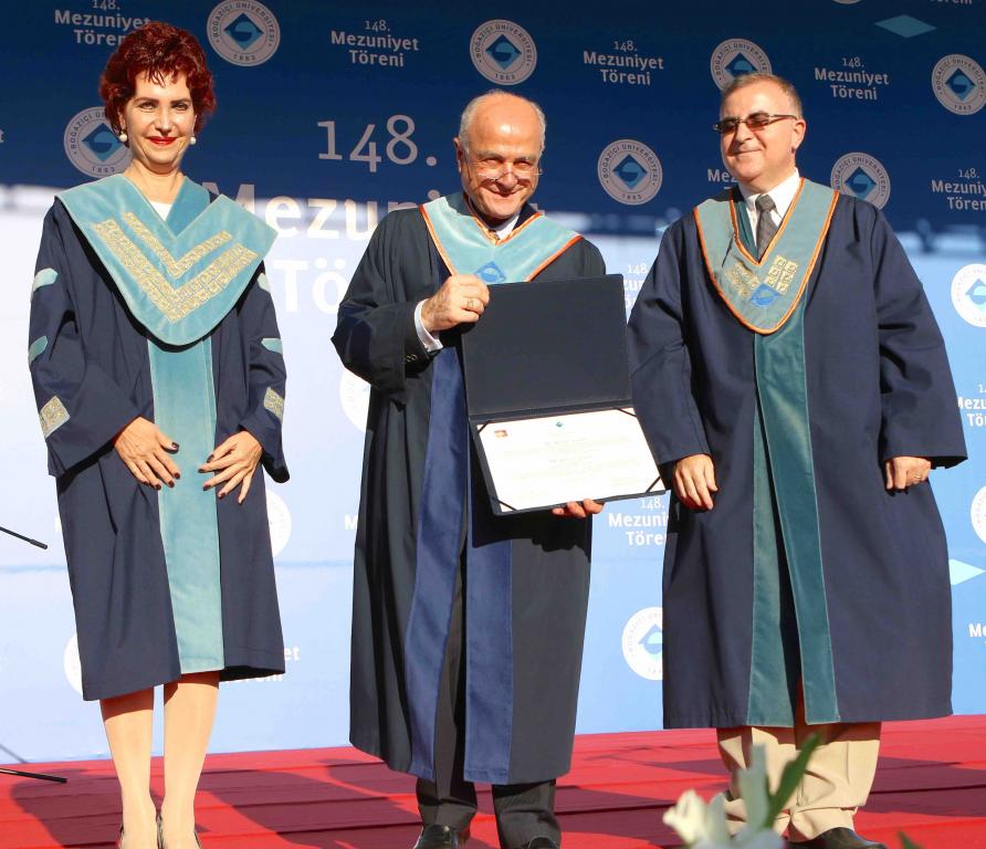 Törende Boğaziçi Üniversitesi Rektör Prof. Dr. Gülay Barbarosoğlu ve Mühendislik Fakültesi Dekanı Levent Akın tarafından Dr. Kenan Şahin’e Fahri Doktora Unvanı takdim edildikten sonra Dr. Kenan Şahin mezunlara hitap etti.