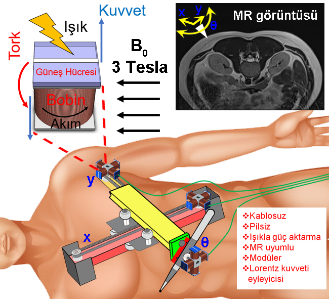 Prof. Dr. Mutlu’nun MR cihazları için geliştirdiği sistemde güç aktarımı elektrik kabloları yerine ışık ile sağlanıyor: “Yapılmak istenen hareketi gerçekleştirmek için MR cihazlarının içinde her zaman bulunan çok yüksek şiddetteki manyetik alandan, örneğin 3 Tesla, faydalanabileceğimizi düşündük. Manyetik alan içindeki bir bobinde elektrik akımını ışık gücüyle oluşturduk. Bu akım, MR cihazının manyetik alanı yardımı ile istenilen hareketi oluşturabildi. MR cihazlarındaki kuvvetli manyetik alanlar yüzünden bu ortama manyetik malzeme ve kablo sokamıyorsunuz. Kablo soktuğunuz anda kablolar ısınmaya başlıyor. MR cihazlarıyla uyumlu piller var ancak pil çevre dostu olmayan ve kısa ömürlü bir enerji kaynağı.”