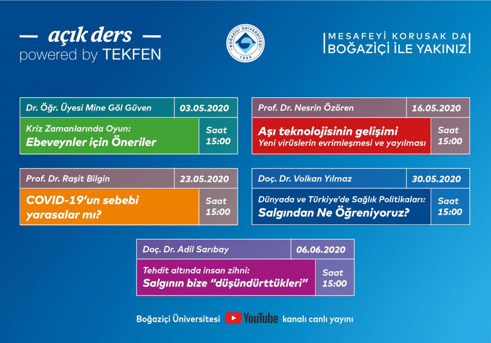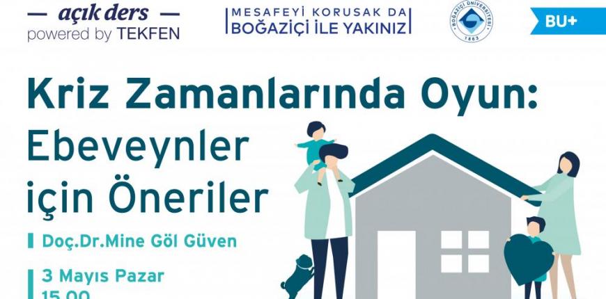 Boğaziçi Üniversitesi, sosyal, beşerî ve fen bilimlerindeki güncel konuları kapsayan ve 4 yıldır “Açık Ders” adıyla düzenlediği seminerlerini online ortama taşıyor. Bu yıl Tekfen Holding desteğiyle Eskişehir, Malatya ve Ardahan’a kadar uzanan seminerler serisi, koronavirüs salgını nedeniyle verilen kısa aranın ardından halka açık ve online olarak düzenlenmeye devam ediyor. Online Açık Dersler’in ilki 3 Mayıs 2020 Pazar günü “Kriz Zamanlarında Oyun: Ebeveynler İçin Öneriler” başlığıyla verilecek.