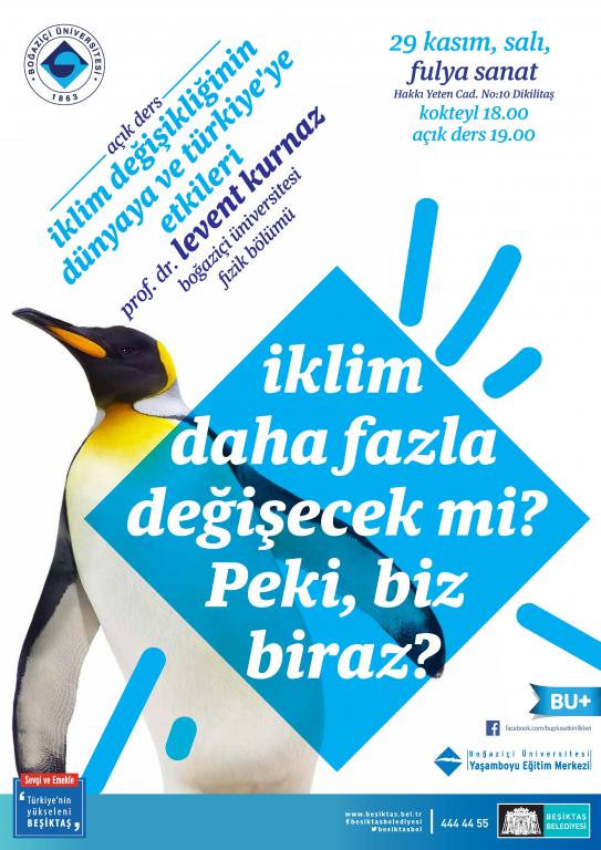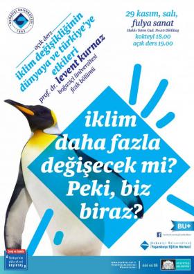 Boğaziçi Üniversitesi öğretim üyeleri tarafından verilen derslerin ilki 29 Kasım’da Prof. Dr Levent Kurnaz’ın “İklim Değişikliğinin Dünya ve Türkiye’ye Etkileri” başlıklı konuşması oldu. Fulya Sanat Merkezi’nde yer alacak ‘’Açık Ders’’ler Boğaziçi Üniversitesi Yaşam Boyu Eğitim Merkezi’nin (BÜYEM) katkıları ve Beşiktaş Belediyesi’nin işbirliğiyle düzenleniyor.