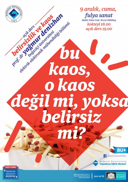 Açık Ders programı kapsamında 9 Aralık 2016 tarihinde Boğaziçi Üniversitesi Elektrik-Elektronik Mühendisliği Bölümü öğretim üyesi Prof. Dr. Yağmur Denizhan, ‘’Belirsizliğin Modellenmesi, Öngörülebilirlik ve Kaos’’ başlıklı dersi verecek.
