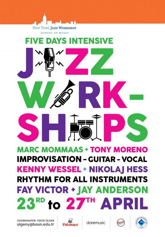 Tony Moreno (ritim), Marc Mommaas (emprovizasyon), Fay Victor (vokal), Jay Anderson (kontrbas) gibi isimlerin yanı sıra dünyaca ünlü gitarist Ornette Coleman’la yıllarca çalışmış olan Kenny Wessel ve piyanoda Fela Kuti, Lee Konitz, Jean Luc Ponty ile çalışmış olan Nikolaj Hess hem performanslarıyla hem de eğitmen kişilikleriyle dünyaca tanınan isimler atölyede yer alacaklar. Dört günlük eğitimin sonunda, 27 Nisan tarihinde saat 18:00'de yer alacak konserde ise atölye katılımcıları ve NYJW müzisyenleri Albert Long Hall'de aynı sahneyi paylaşacak.