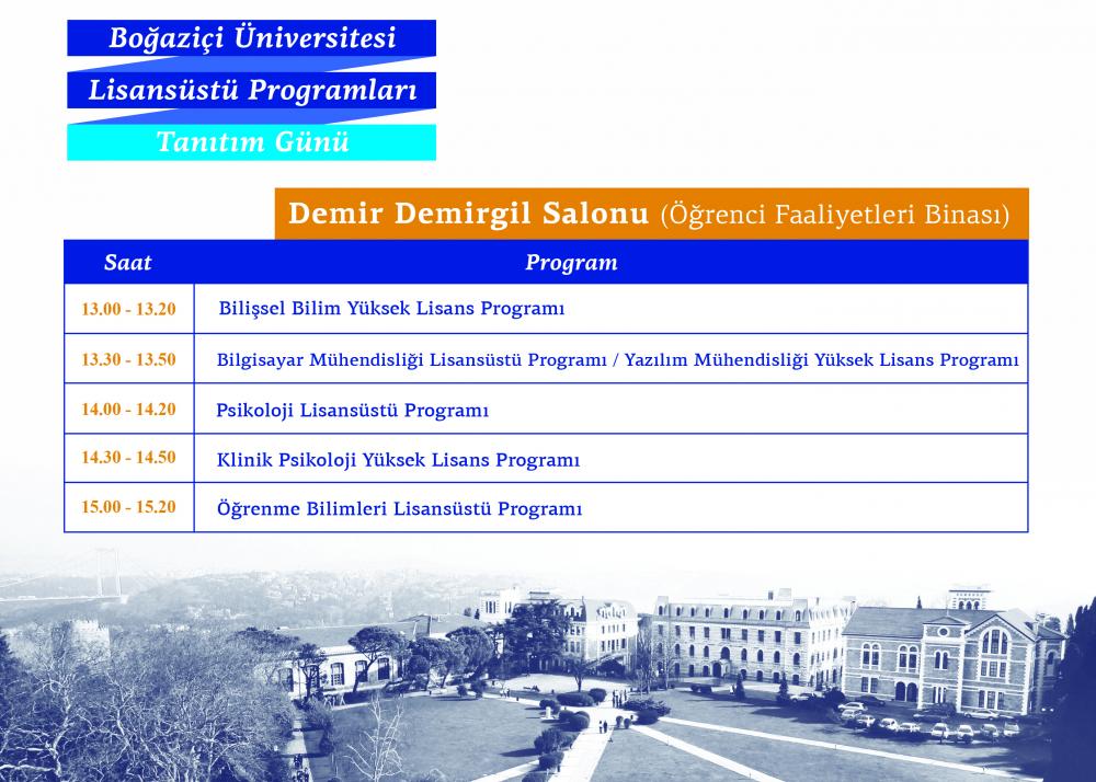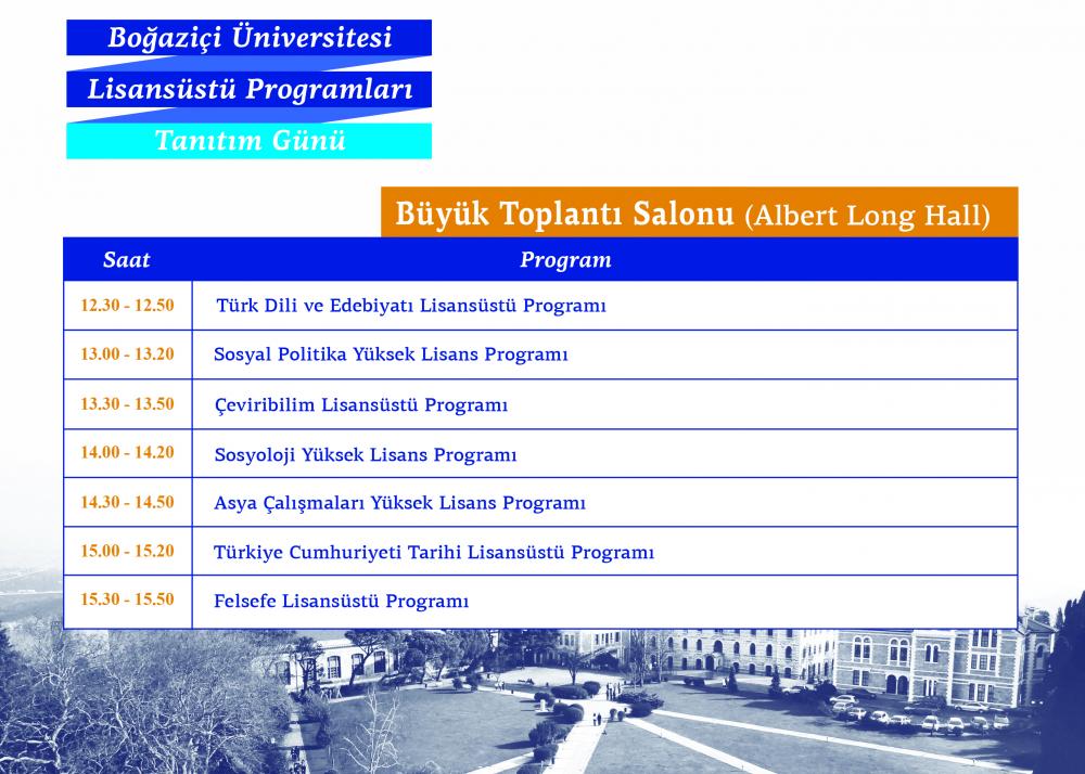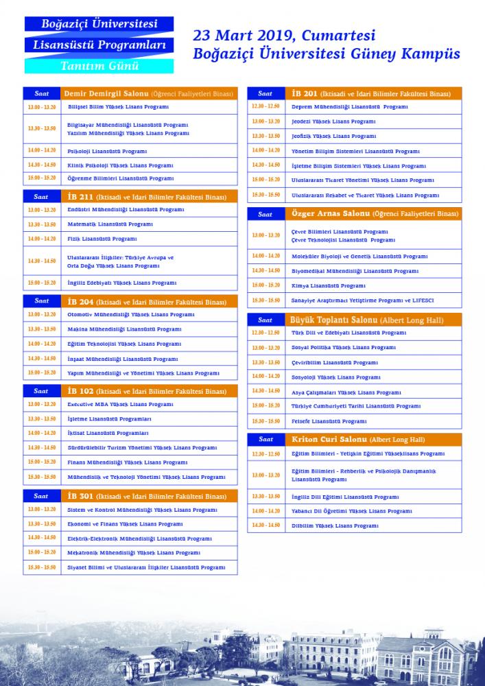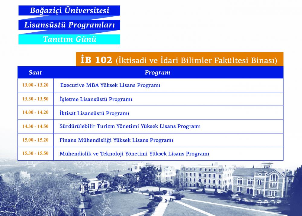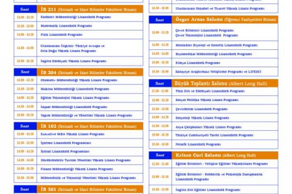 Yüksek Lisans, Doktora Programları ve İkinci Öğretim Yüksek Lisans Programları ile ilgili detaylı bilgi vermek üzere kurulacak tanıtım standları Albert Long Hall'de (Saatli Bina) saat 10.00 – 18.00 saatleri arasında açık olacak. Bununla birlikte, düzenlenecek tanıtım seminerleri ise, Demir Demirgil Salonu, İktisadi İdari Bilimler Fakültesi'nde İB 211, İB 204, İB 102, İB 301 ve B 201, Albert Long Hall binasındaki Kriton Curi Salonu ve Özger Arnas Salonu'nda gerçekleştirilecek.