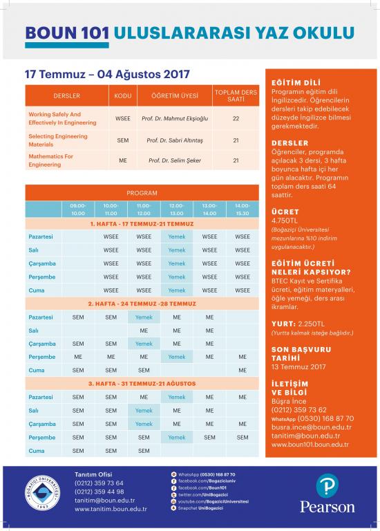BOUN101 Uluslararası Yaz Okulu kapsamında BTEC* Mühendislik Sertifika Programı’na katılan öğrenciler yurtdışı üniversite başvurularında müfredat dışı aktivitelerde ve portföylerde sertifikalarını kullanarak bazı derslerden muaf olabilecek. Öğrencileri gelecekteki akademik ve mesleki kariyerlerine hazırlayacak olan eğitim programında Prof. Dr. Mahmut Ekşioğlu, Prof. Dr. Sabri Altıntaş, Prof. Dr. Selim Şeker ders verecek.