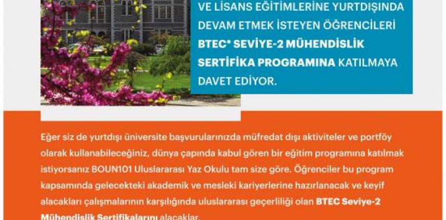 Boğaziçi Üniversitesi, mühendislik ve fen alanına yönelmek isteyen lise öğrencilerine yönelik BTEC* Mühendislik Sertifika Programı başlatıyor. Uluslararası eğitim şirketi Pearson iş birliğiyle Türkiye’de ilk defa bir yaz okulu bünyesinde uygulanacak olan eğitim programı dünya çapında kabul görecek.