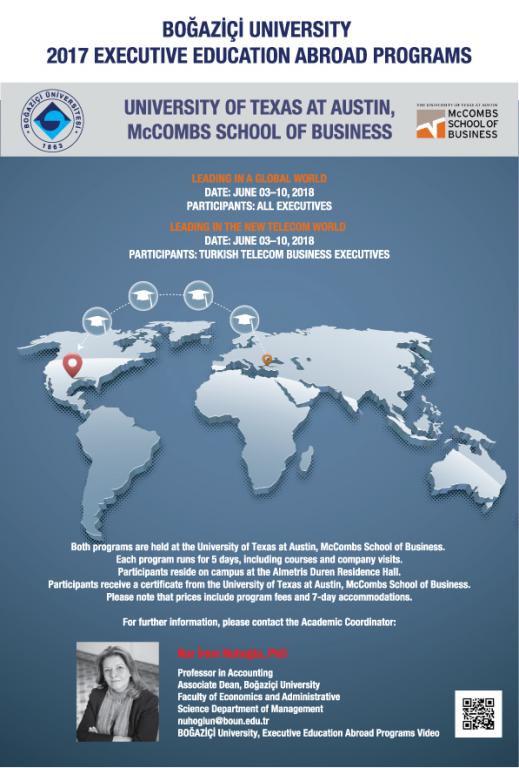 Boğaziçi Üniversitesi organizasyonu ve dünyada “lider eğitimi” konusunda ilk sıralarda yer alan University of Texas at Austin, McCombs School of Business işbirliğiyle Türk yöneticilerine özel olarak hazırlanmış sertifikalı eğitim programlar kapsamında 3-10 Haziran 2018 döneminde ‘’Leading in a Global World’’ ve ‘’Leading in the New Telecom World’’ başlıklı eğitimler verilecektir. Akademik koorddinatörlüğünü Prof. Dr. İrem Nuhoğlu’nun yaptığı, her biri beş gün sürecek olan eğitimler kapsamında çeşitli şirket ziyaretleri de gerçekleştirilecek.