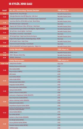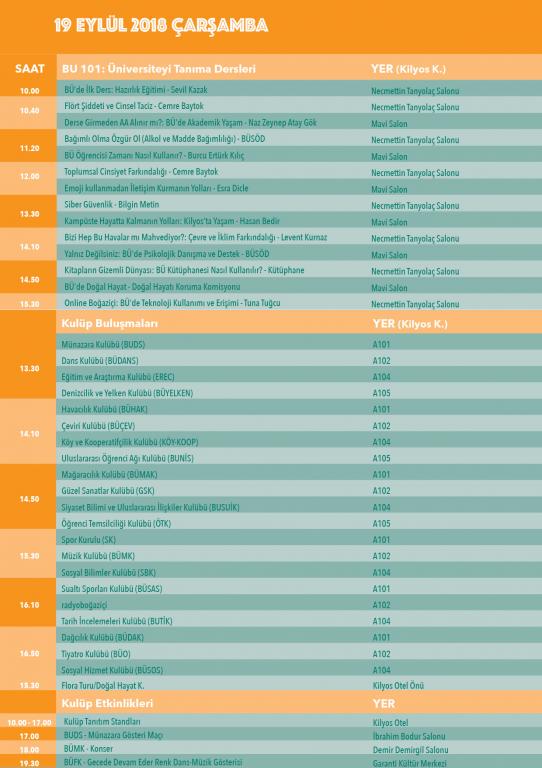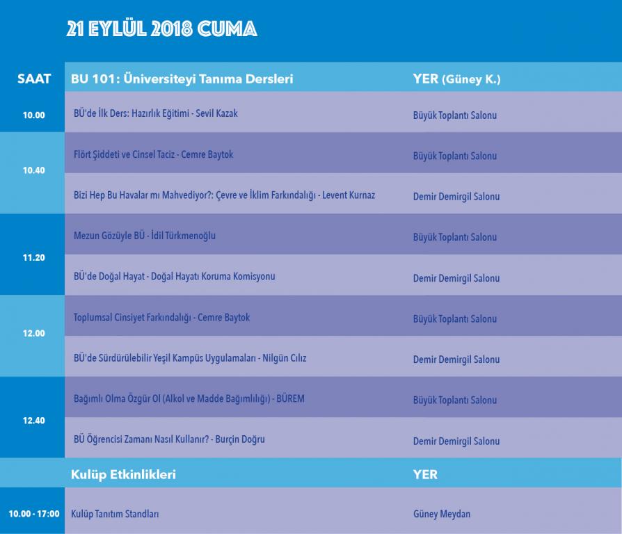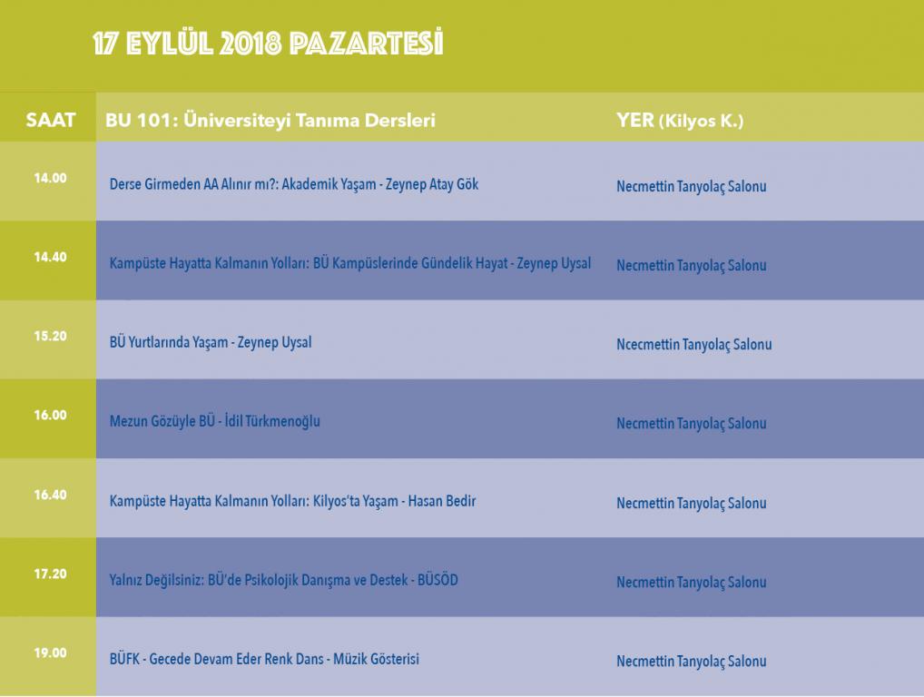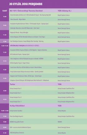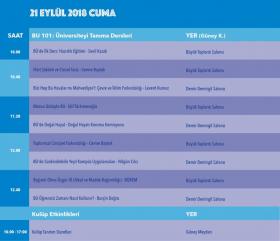 Toplam beş gün sürecek olan Üniversiteyi Tanıma Günleri kapsamında öğrencilerin dersleri kolaylıkla takip edebilmesi için her ders Kilyos Sarıtepe Kampüsü’nde ve Güney Kampüs’te tekrarlanacak. 17, 18 ve 19 Eylül 2018 tarihlerinde Kilyos Sarıtepe Kampüsü’nde sunulacak başlıklar, 20 ve 21 Eylül 2018 tarihlerinde ise Güney Kampüs’te izlenebilecek.