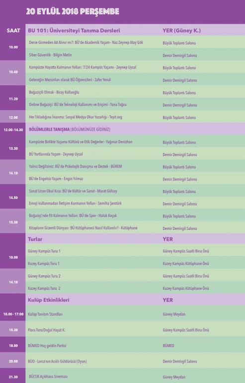 Boğaziçi Üniversitesi’ne yeni katılan öğrenciler 17-21 Eylül 2018 tarihleri arasında Kilyos Kampüsü ve Güney Kampüs’te gerçekleştirilecek renkli bir programla, beş gün boyunca üniversitedeki akademik ve kültürel yapıyı tanıma şansı bulacaklar.