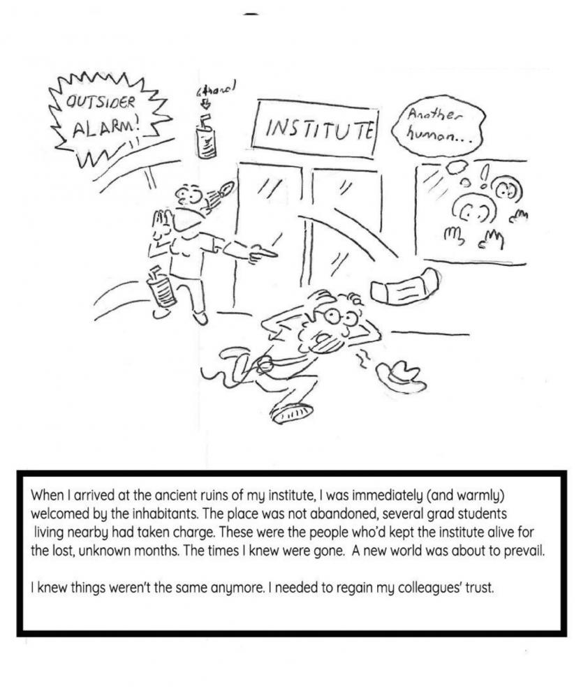 Evet! Üç ay boyunca evde kalmıştım ancak bölüm varlığını bir yandan devam ettiriyordu. Deney hayvanlarımızın bu dönemde düzenli bakımları gerçekleşti. Aradan geçen zamanla ben laboratuvara tekrar girdiğimde kendimi tarihin akışından kopmuş şekilde, laboratuvarı da dış dünyadan kopmuş şekilde hayal ettim. Indiana Jones misali kendi bölümümü keşfe çıktığım bir macera yazdım. Orada üç ay boyunca araştırmalarını devam ettiren bilim insanları vardı. Özellikle Covid-19 aşısı üzerine çalışma yapan meslektaşlarım evlerine gitmiyorlar, misafirhanede kalıyorlar. Hiç unutmam ben laboratuvara geri döndüğüm ilk gün metrobüsle geldiğim için arkadaşlarım bana korkuyla bakmışlardı. Bu ilk karşılaşmaların gerginliklerini biz bölüm içinde cidden yaşadık. Bu karşılaşmaları karikatürize ettim. Figürler de tamamen kendi tanıdıklarımın karikatürize edilmiş halleridir. Laboratuvardaki arkadaşlarımın ilgimi çeken fiziki ya da karakteristik özelliklerini vurgulayan çizimler yapmaya çalıştım. Kişiyi zedelemeyecek, bilakis o kişinin incelendiğini ve değer verildiğini gösterdiğim motifler koydum.
