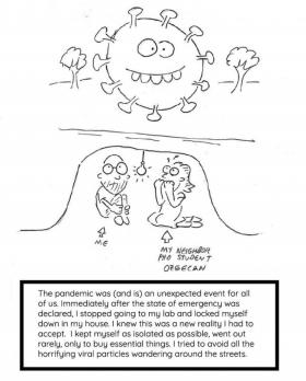 Yarışma duyurusuna sosyal medyada denk gelip katılmaya karar verdim. Avrupa Biyokimya Dernekleri Federasyonu, bir süredir görsel sanatların önemine dikkat çekiyor. Yayımladıkları hakemli derginin kapak tasarımı için yarışmalar düzenlediklerini biliyorum. Genel olarak Avrupa ve Amerika’da görsel sanatları temel bilimlerle temas ettirme çabası giderek yaygınlık kazanıyor. Avrupa’da bu anlamda öne çıkan Avrupa Biyokimya Dernekleri Federasyonu, pandemi döneminde biyologların hayatlarının nasıl değiştiğini yansıtan yani pandeminin insani bir boyutuna değinen bir iletişim yarışması düzenlemeye karar vermiş. Ben yarışmaya katılımın daha çok video ağırlıklı olmasını bekliyordum. Sanırım salgın dolayısıyla laboratuvarda lojistik olarak bir grubu toplamanın göze alınamamasından ötürü yarışmaya en fazla çizimle katılım sağlandı. Ben de bir çizgi roman hazırlayarak pandeminin sosyal karşılıklarını anlatabilirim diye düşünmüştüm. Zaten yarışmadan önce kendi laboratuvar hayatımı resmetmeye çalıştığım bazı çizimlerim vardı. O anlamda laboratuvar hayatını kâğıda dökme konusunda elim yatkındı.