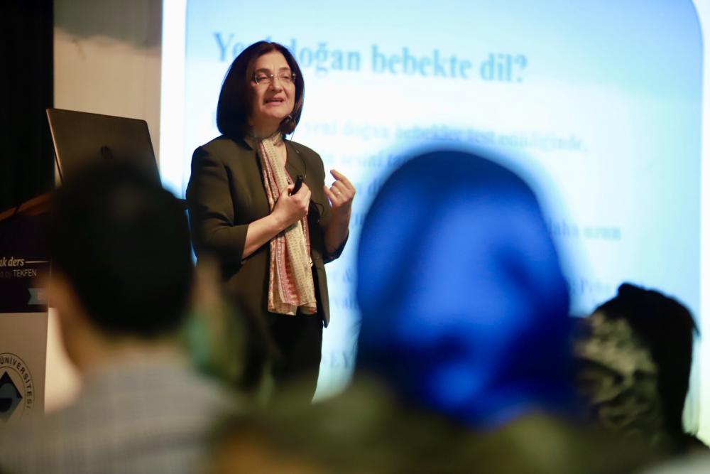 Dil işlemleme sürecinin doğumdan önce başladığını belirten Prof. Dr. Belma Haznedar, yeni doğan bir bebeğin bile annesinin sesini ayırt edebildiğini ifade etti: “Dilim prozodisi (ezgisi) anne karnında ayırt edilmeye başlanıyor ve 2 aylık bir bebek bile çevresinde konuşulan dilin diğerlerinden farklı olduğunu ayırt edebiliyor. Bu doğrultuda anadiline ve diğer dillere farklı tepkiler veriyor. İki ya da daha fazla dile maruz kalmak çocuğun kafasını karıştırmaz, çocuk kullanma olanağına sahip olduğu sürece dilleri kolaylıkla birbirinden ayırabilir.”