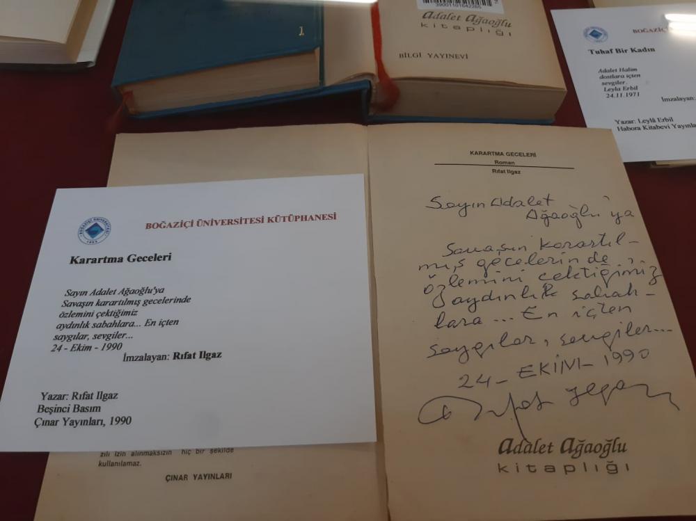 Aziz Nesin, Leyla Erbil, Murat Gülsoy, Vedat Türkali, Sevgi Soysal ve Orhan Kemal gibi Ağaoğlu'nun edebiyatçı dostlarının kendisi için imzaladığı kitapların ilk sayfalarında yazdıkları notlar da sergide öne çıkan eşyalar arasında yer alıyor.