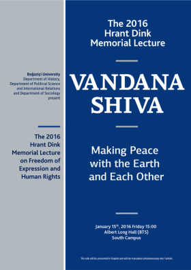 Vandana Shiva, 15 Ocak 2016 tarihinde, saat 15.00'te Albert Long Hall'de gerçekleştirilecek konferansta ''Dünyayla ve Birbirimizle Barışmak'' başlıklı bir konuşma yapacak.