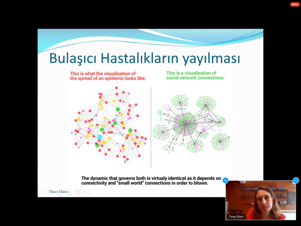 Boğaziçi Üniversitesi Endüstri Mühendisliği Bölümü öğretim üyesi Prof. Dr. Taner Bilgiç’in moderatörlüğünde gerçekleşen konuşmada, korona günleriyle birlikte hayatımıza giren sayılar, grafikler ve üssel büyüme gibi kavramları nasıl anlamamız gerektiği sorusu ele alındı. Doç. Dr. Tınaz Ekim, herkesin bu kavramları bilmek zorunda olmadığını ancak bunları bildiğimiz takdirde salgın önlemlerine daha çok ikna olarak uygulayabileceğimizi vurguladı.