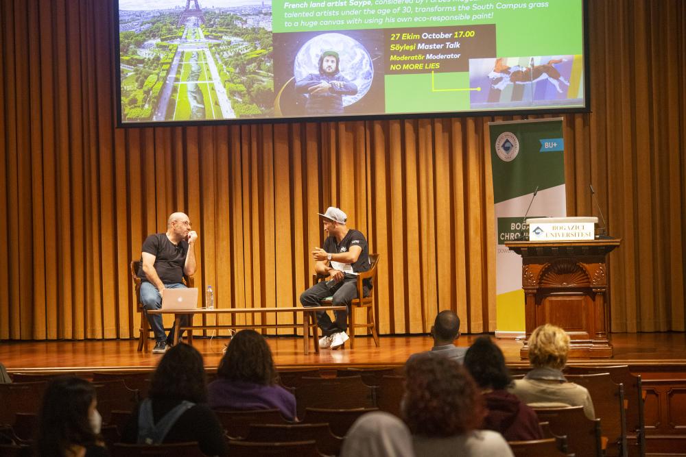 “Doğayı etkilemeden insanları etkilemek” mottosuyla çalışmalarını sürdüren Fransız Land Artist Saype 15-30 Ekim arasında Boğaziçi Üniversitesi Güney Meydan/ Üstün Ergüder Meydanı çimlerini doğada yüzde yüz çözünebilen özel bir boyayla boyadı. Dünyanın en büyük insan zincirini yaratmak amacıyla 2019’da başlattığı “Beyond Walls” projesi kapsamında daha önce Paris, Andorra, Cenevre, Berlin, Ouagadougou ve Yamoussoukro kentlerinden de devasa fresko tasarlayıp hayata geçiren Saype, TEKFEN Holding’in sponsorluğunda yapılan “Boğaziçi Chronicles Master Talk” etkinliğinin de 27 Ekim'deki konuğu oldu.