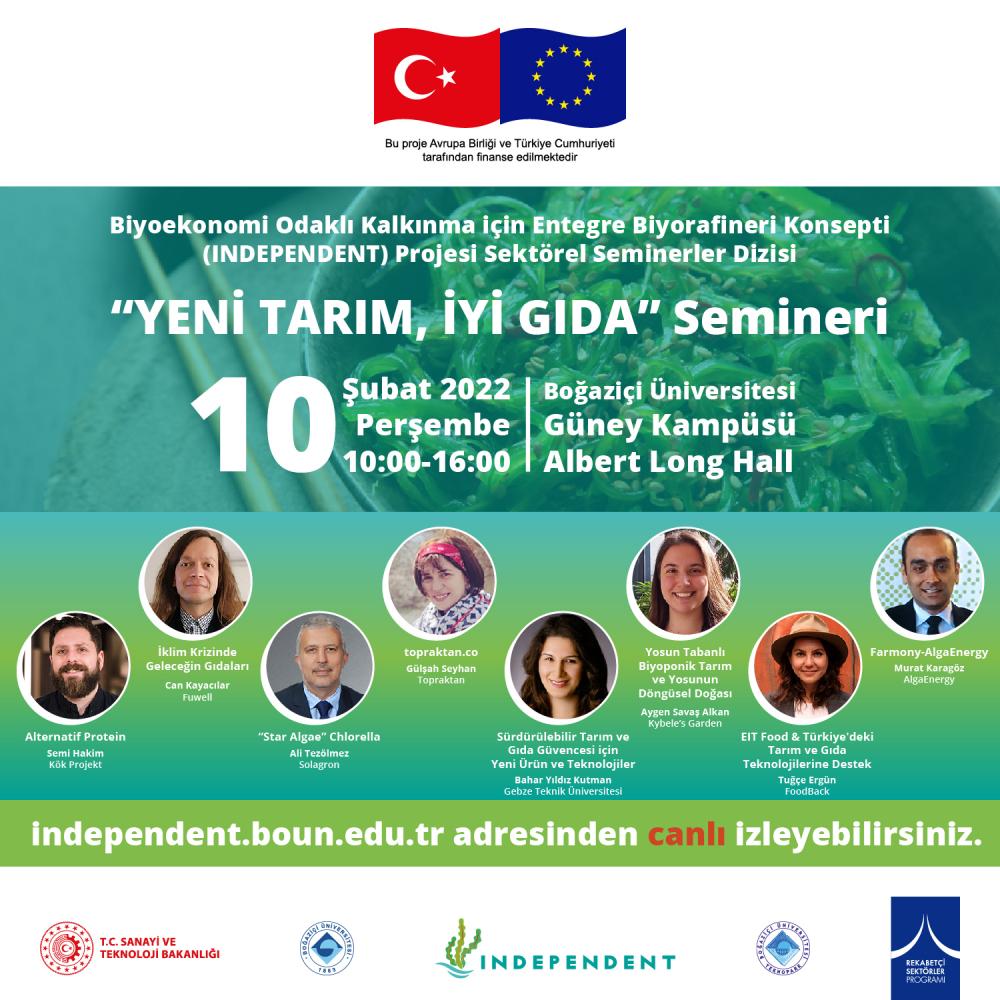 Biyoekonomi Odaklı Kalkınma için Entegtre Biyorafineri Konsepti (INDEPENDENT) projesi kapsamında düzenlenen “Yeni Tarım, İyi Gıda” seminerinde bitki, yosun, diğer canlılar ile laboratuvar ortamında elde edilen besin değeri yüksek gıdalar konuşuldu. INDEPENDENT Projesi Koordinatörü Dr. Öğr. Üyesi Berat Haznedaroğlu mikroyosunlardan elde edilen yeni gıda ürünlerine dikkat çekerken projenin sürdürülebilir kaynaklarla üretilen protein değeri yüksek gıdaların üretilmesindeki önemine işaret etti.