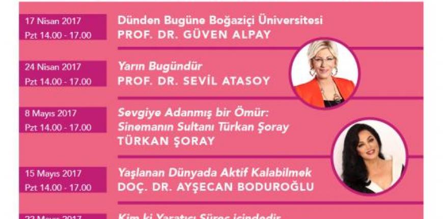 17 Nisan - 5 Haziran 2017 tarihleri arasında Pazartesi günleri 14.00-17.00 arasında Boğaziçi Üniversitesi’nin Güney Kampüs’te (Bebek) yapılacak Aktif Yaşam Seminerleri’nin ilk konuğu 17 Nisan’da Boğaziçi Üniversitesi İşletme Bölümü Emeritus öğretim üyesi Prof. Dr. Güven Alpay’ın "Dünden Bugüne Boğaziçi Üniversitesi" semineriyle devam edecek. Ardından, 24 Nisan’da İstanbul Üniversitesi Adli Tıp Enstitüsü öğretim üyesi Prof. Dr. Sevil Atasoy, “Yarın Bugündür” konu başlığı ile katılımcılarla buluşacak.