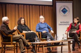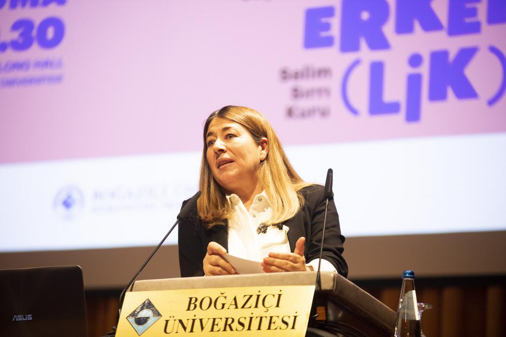Açılış konuşmalarının ardından Boğaziçi Üniversitesi Türk Dili ve Edebiyatı Bölümü Dr. Öğr. Üyesi Olcay Akyıldız’ın moderatörlüğünde “erkeklik” teması tartışılmaya başlandı. “Erkekliği ne övmeye ne de gömmeye geldik” sözleriyle eleştirel bir düzlemde tartışma yürütmeyi amaçladıklarını belirten Akyıldız, erkekliğe dair meselelerin konuşulmasının toplumsal cinsiyet eşitliğini sağlamada önemli olduğunu vurguladı. Olcay Akyıldız sözlerini “Toplumsal cinsiyet eşitsizliği konuşulurken sadece mağdurun değil failin kim olduğuna bakmak da önemli ve geleneksel normların yarattığı imtiyazlar sadece kadınlar üzerinde değil “makbul olmayan” erkekler üzerinde de ezici bir mekanizma oluşturuyor.” ifadeleriyle tamamladı.