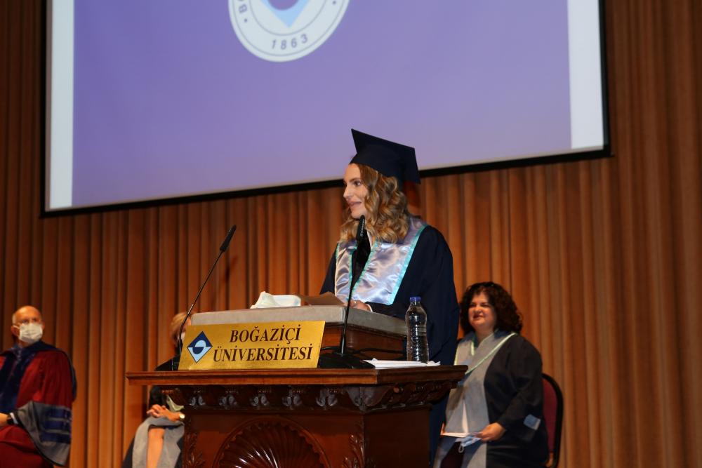 Fiziksel mesafe kurallarına uymak adına gün boyunca her program için ayrı yapılan törenlerin ilki Uluslararası Rekabet ve Ticaret Yüksek Lisans Programı mezunları için gerçekleşti. Sosyal Bilimler Enstitüsü Müdürü Prof. Dr. Ünal Zenginobuz’un konuşmasıyla başlayan törende, Program Başkanı Dr. Öğr. Üyesi Mehtap Işık da mezunlara seslendi. Mezunlar adına konuşmayı ise programı birincilikle bitiren Mina Alara Akgün gerçekleştirdi. Bu yıl Uluslararası Rekabet ve Ticaret Yüksek Lisans Programı’ndan tezsiz yüksek lisans derecesi almaya hak kazanan kişi sayısı 13 oldu.