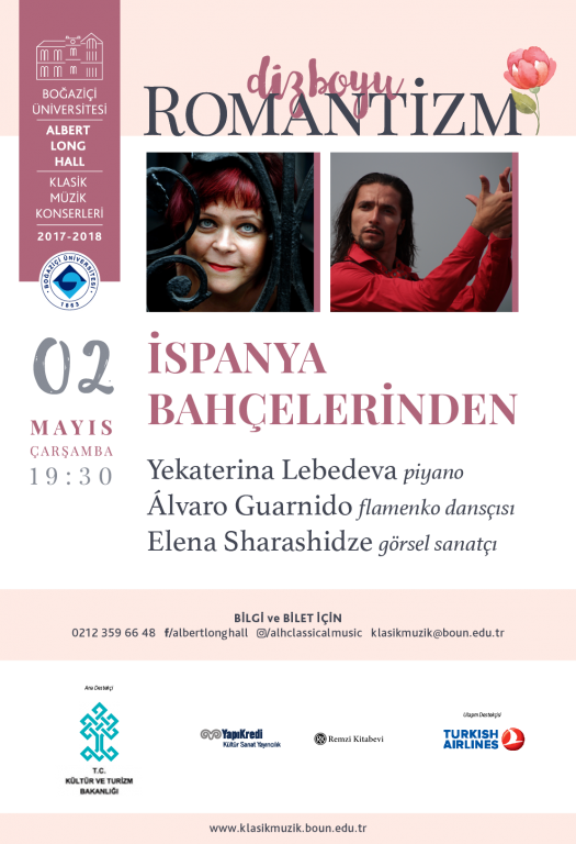 2017-2018 döneminde Kültür ve Turizm Bakanlığı ve Türk Hava Yolları’nın desteği ile gerçekleştirilen Boğaziçi Üniversitesi Albert Long Hall Klasik Müzik Konserleri’nin Bahar Dönemi, “İspanya Bahçelerinden” konseri ile 2 Mayıs akşamı sona erecek. Albert Long Hall bu konserde Rus piyanist Yekaterina Lebedeva ile flamenkonun zengin ritm ustası Álvaro Guarnido’yu ağırlayacak.
