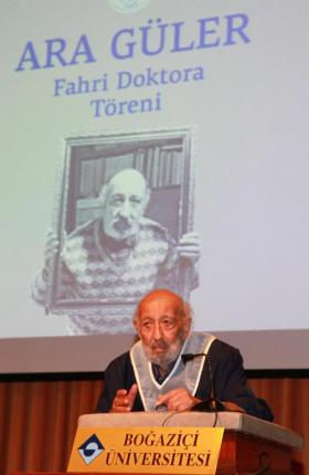 Ara Güler dört yıl önce törende yaptığı konuşmada ‘’Böyle bir yere gelip konuşma yapacağını hiç düşünmediğini’’ ifade etmiş ve "Şimdi de ne düşündüğüm belli değil. Aslında bunlar hoş, güzel şeylerdir. Hoşuma da gidiyor. Gerçi bu üçüncü doktoram ama bunlar bende birtakım dürtülere neden oluyor. Sizin için daha iyi bakacağım dünyaya, bundan sonra daha başka şeyler de ilave edeceğim" diye seslenmişti.